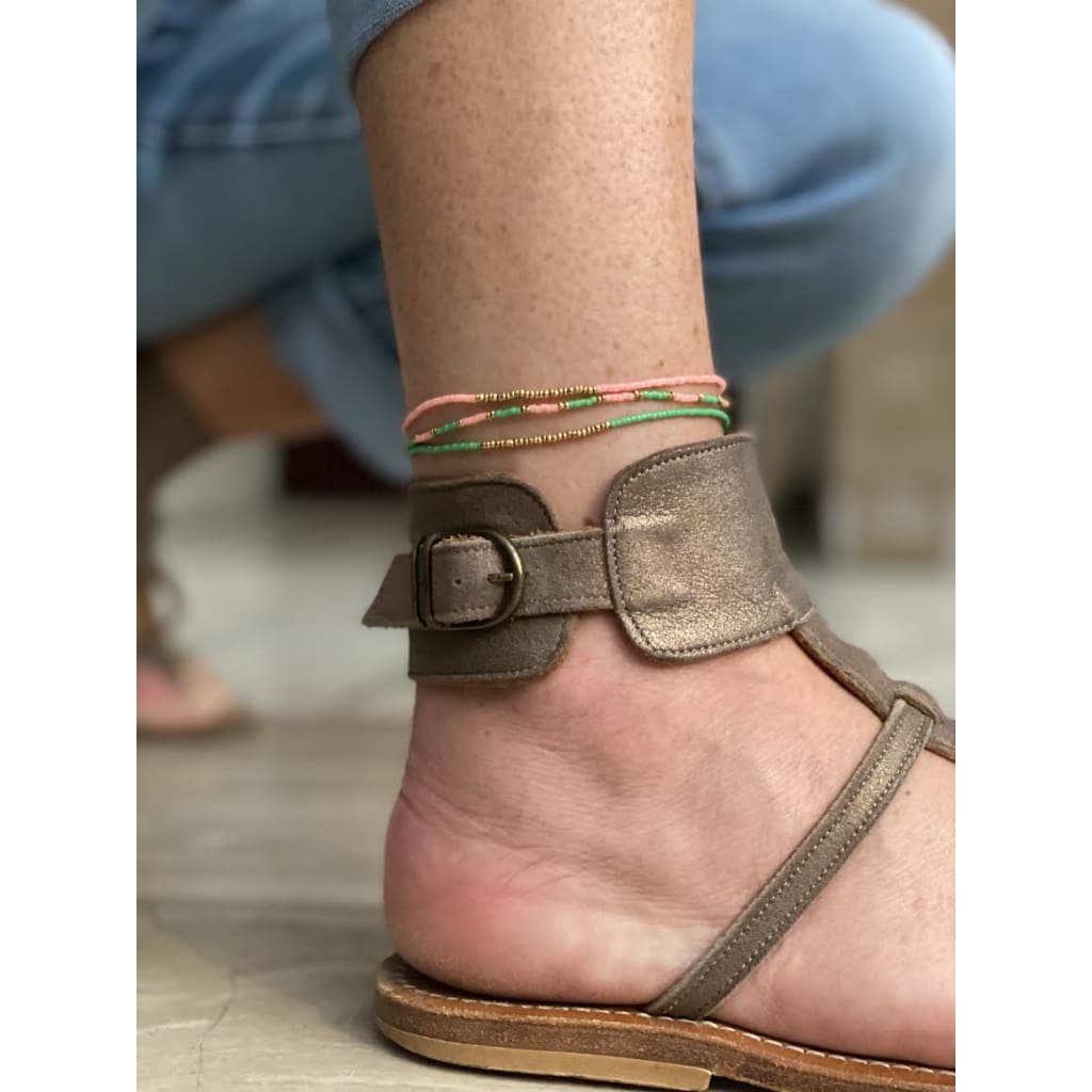 Bracelet de cheville monté sur cordon polyester, composé de rocailles Miyuki délicat et d'hématites dorées.