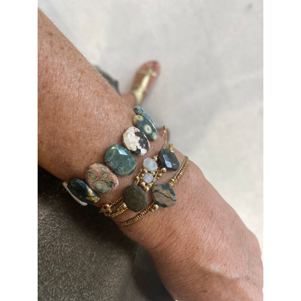 Bracelet monté sur un fil polyester, composé d'une perles en jaspe océan et hématites dorées. La simplicité et l'élégance de ce bracelet sera le cadeau parfait à porter avec d'autres bijoux.