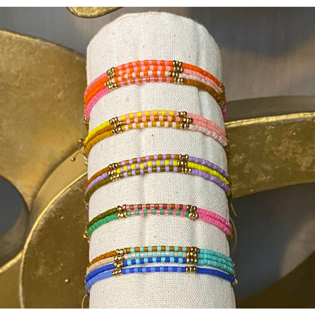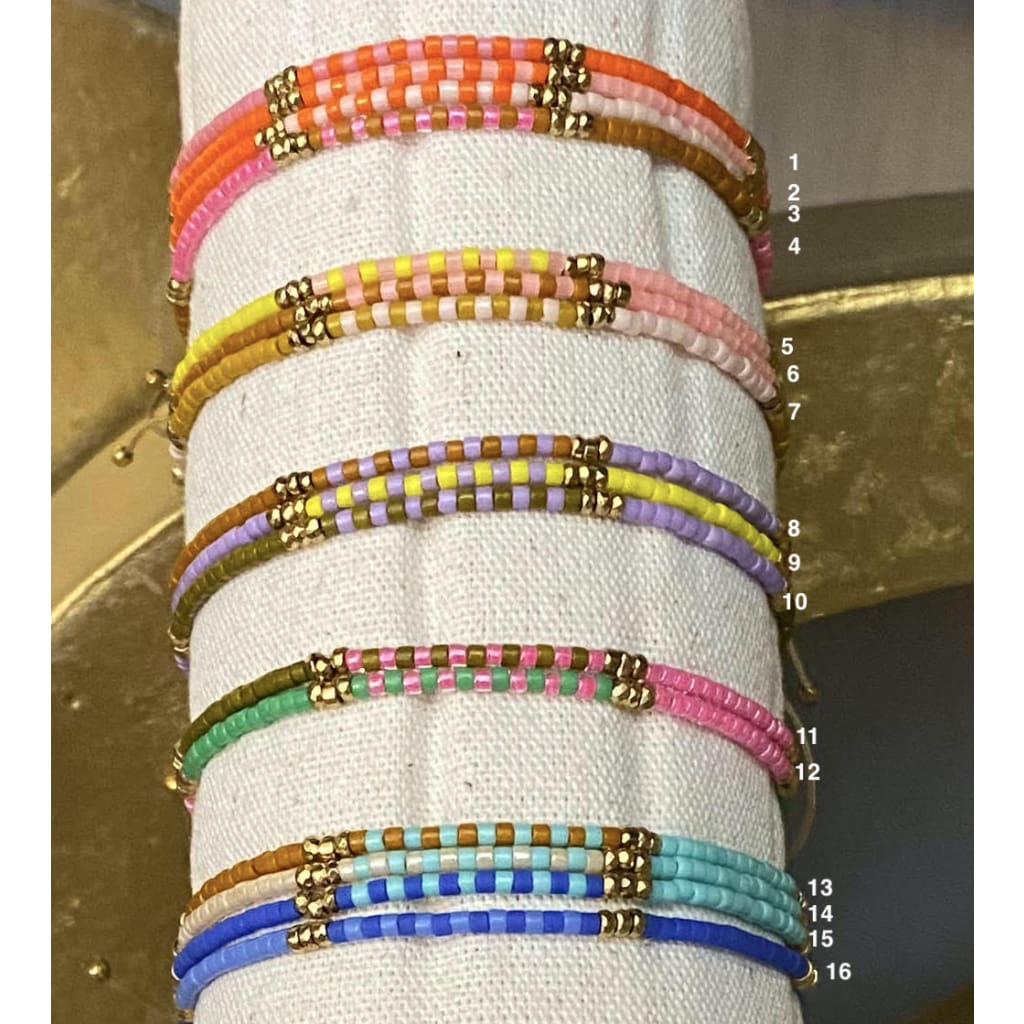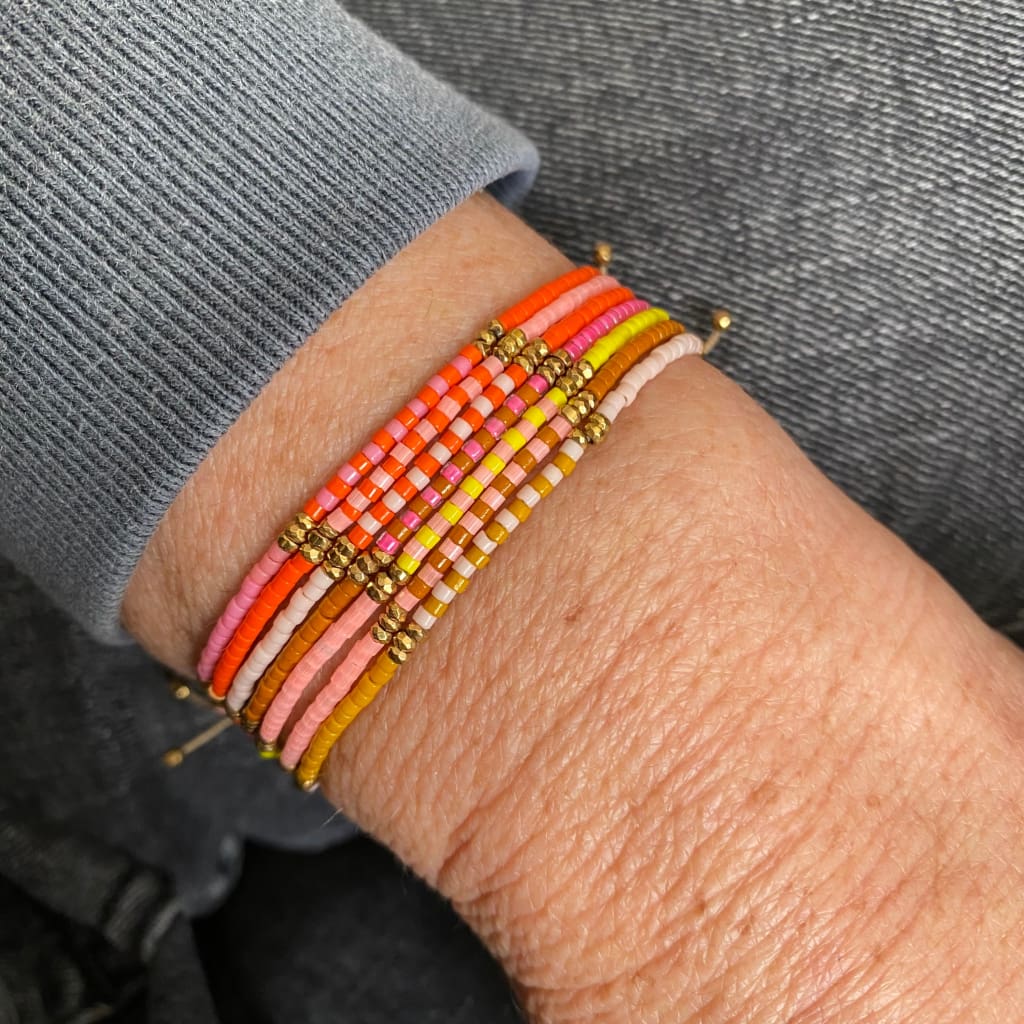 Bracelet sur cordon polyester, composé d'hématites dorées et de rocailles miyuki délica. Vous trouverez en ce bracelet un éclat étincelant avec un large choix de couleurs, qui fera votre bonheur ou la joie de pouvoir l’offrir.