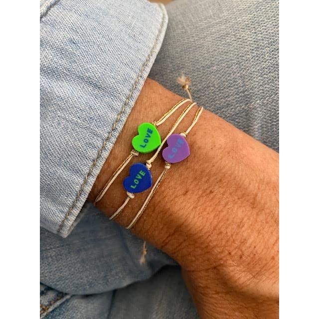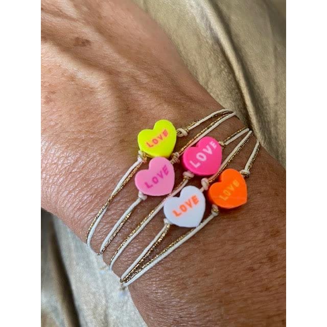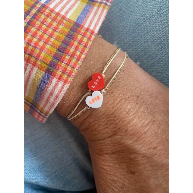 Bracelet monté sur 2 cordons blanc et doré et coeur LOVE en polymère. Vous trouverez dans ce bracelet un large choix de couleurs, qui fera votre bonheur ou la joie de pouvoir l’offrir.