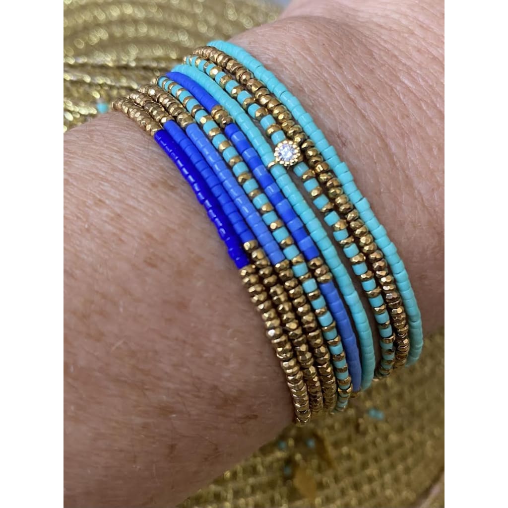 Manchette de 5 bracelets sur cordon polyester, composée d'hématites dorées, de rocailles miyuki délica et d'un strass. Vous trouverez en cette manchette l'accessoire idéal pour habiller vos poignets cet été.