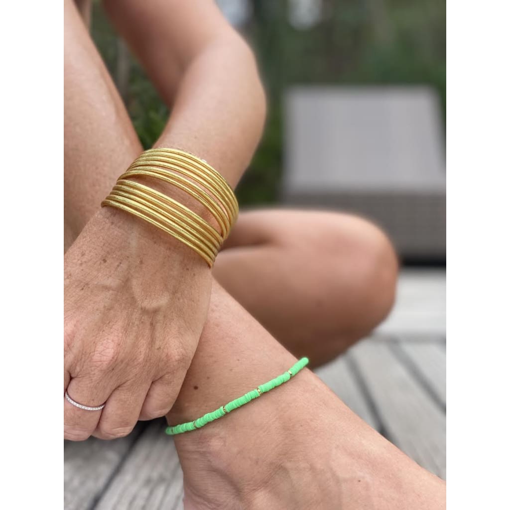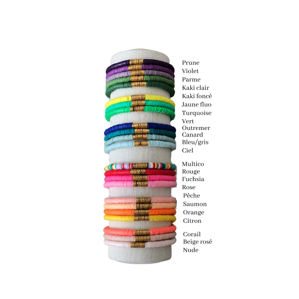 Bracelet de cheville monté sur cordon polyester, composé de rondelles Heishi en polymère et de rondelles en hématite dorée.