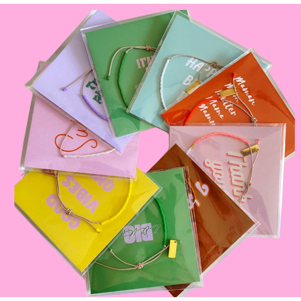 9 jolies cartes messages à offrir pour tous les instants de la vie, accompagné d'un bracelet coloré.