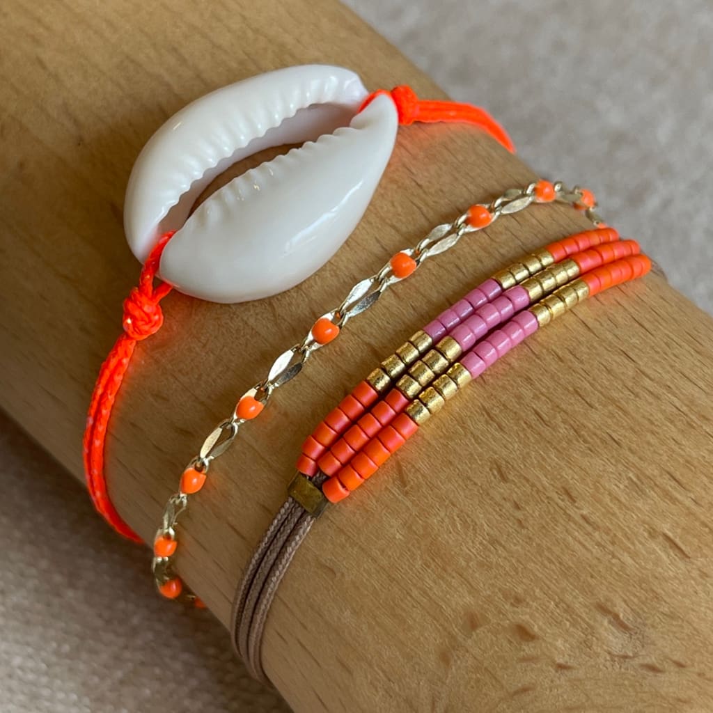 1. Bracelet sur fil polyester orange fluo et coquillage