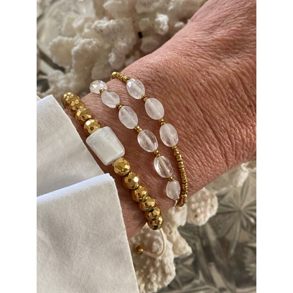 Bracelet sur cordon polyester, composé de différentes pierres fines : Cristal de roche et pierre de lune.