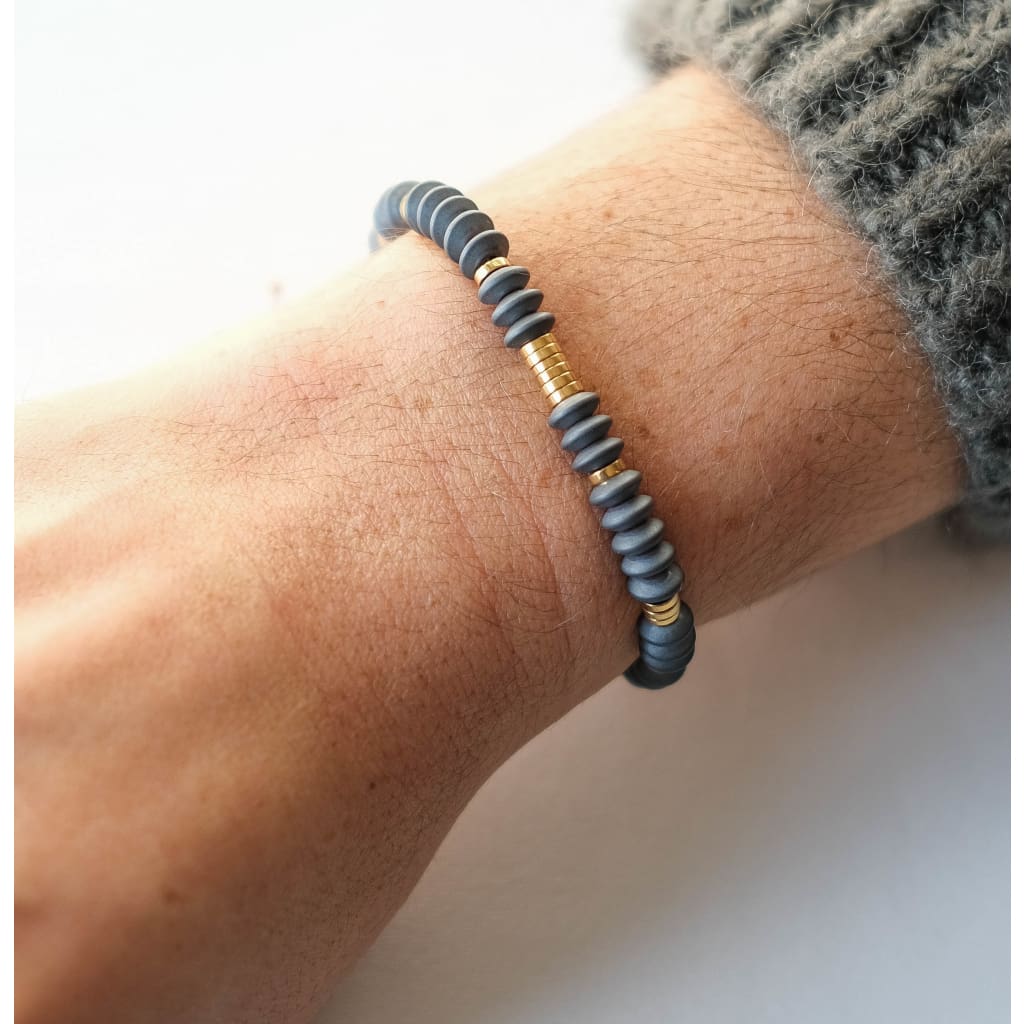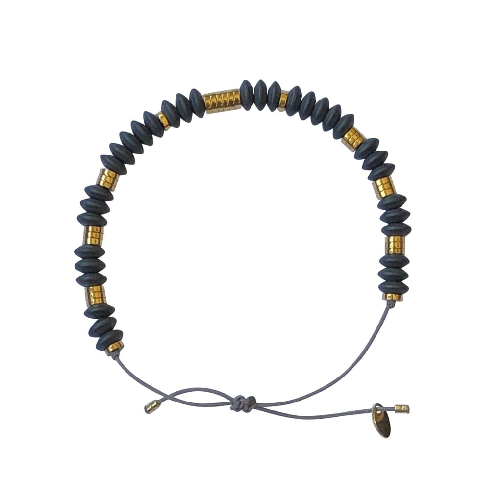 Bracelet monté sur un fil polyester, composé de perles en hématites grises et hématites dorées. La simplicité et l'élégance de ce bracelet sera le cadeau parfait à porter avec d'autres bijoux.