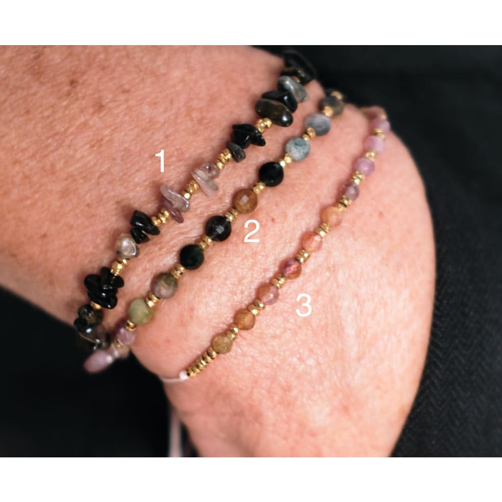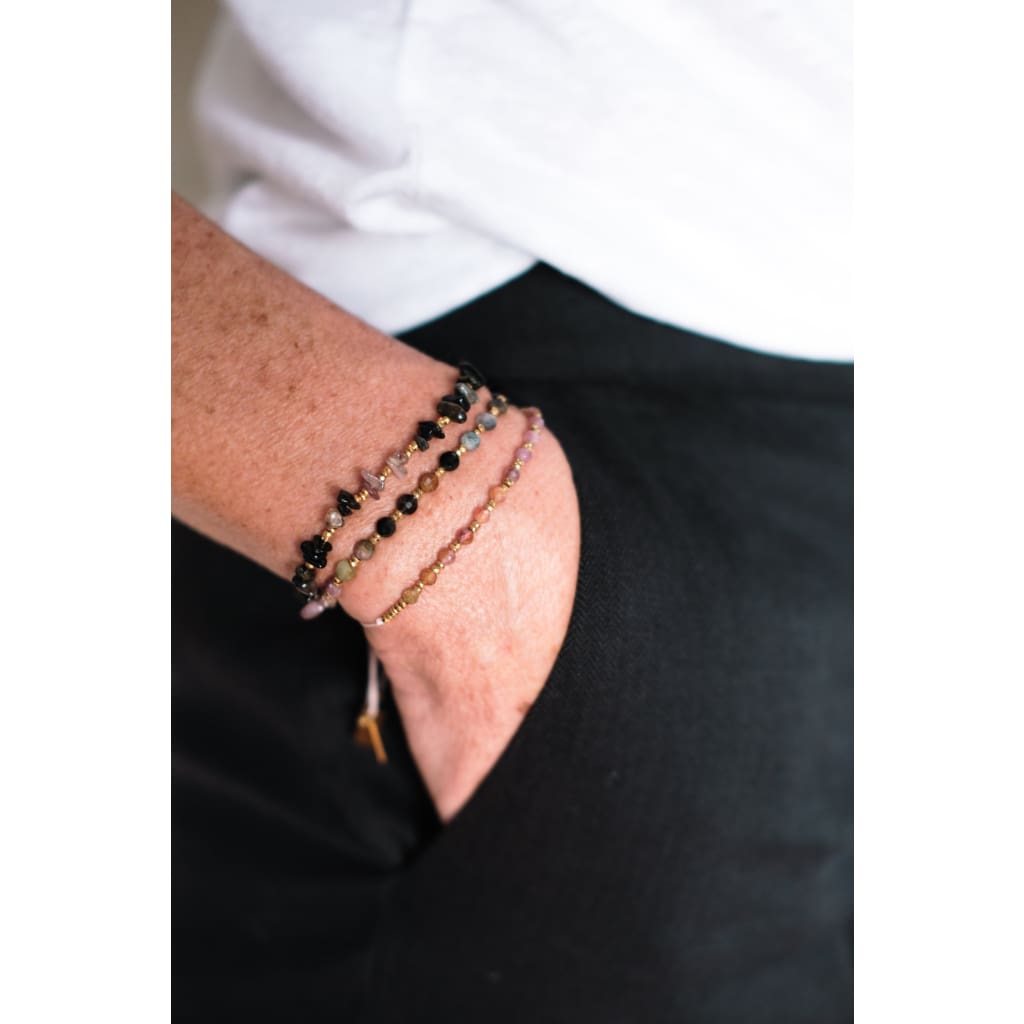 Bracelet sur cordon polyester, composé de différentes pierres fines. Cette composition de Tourmaline sera parfaite pour mettre en valeur votre poignet.