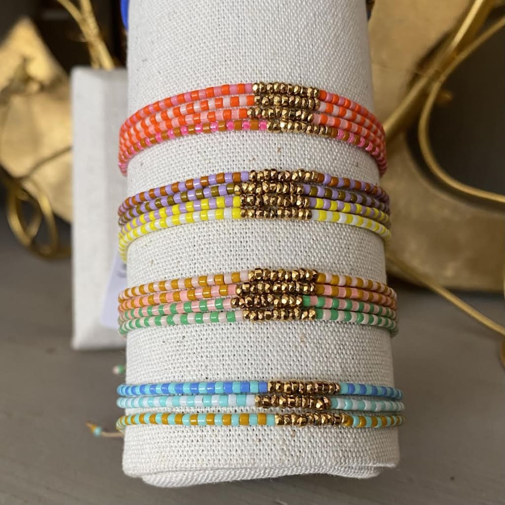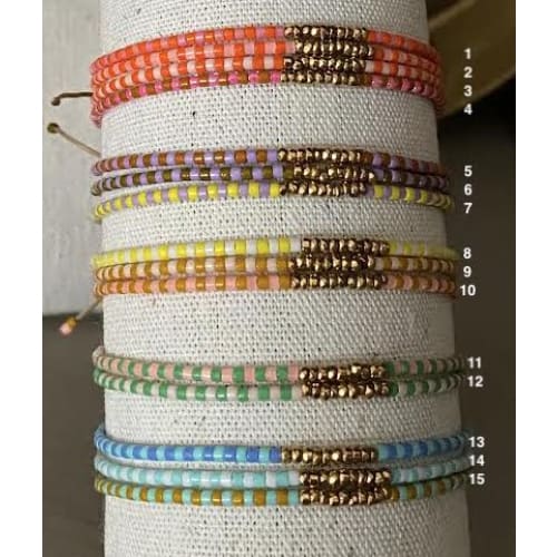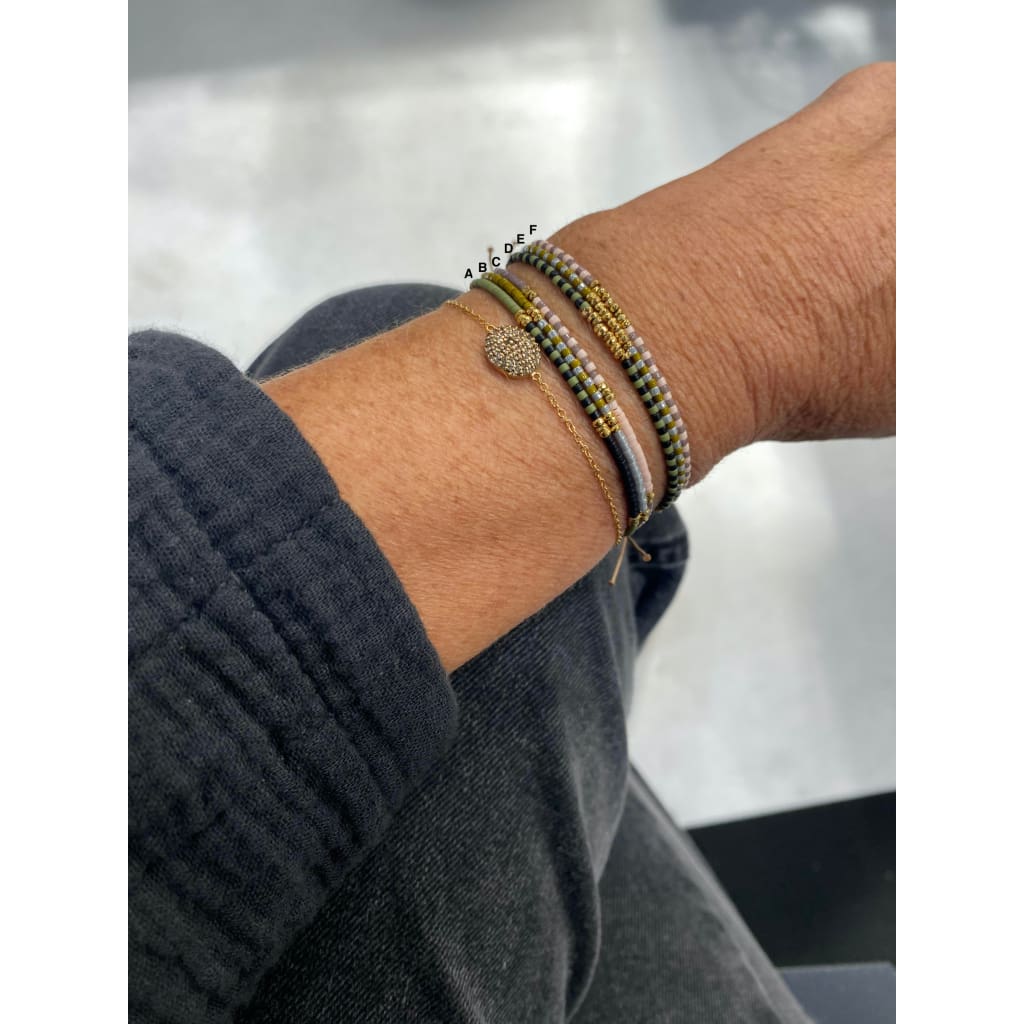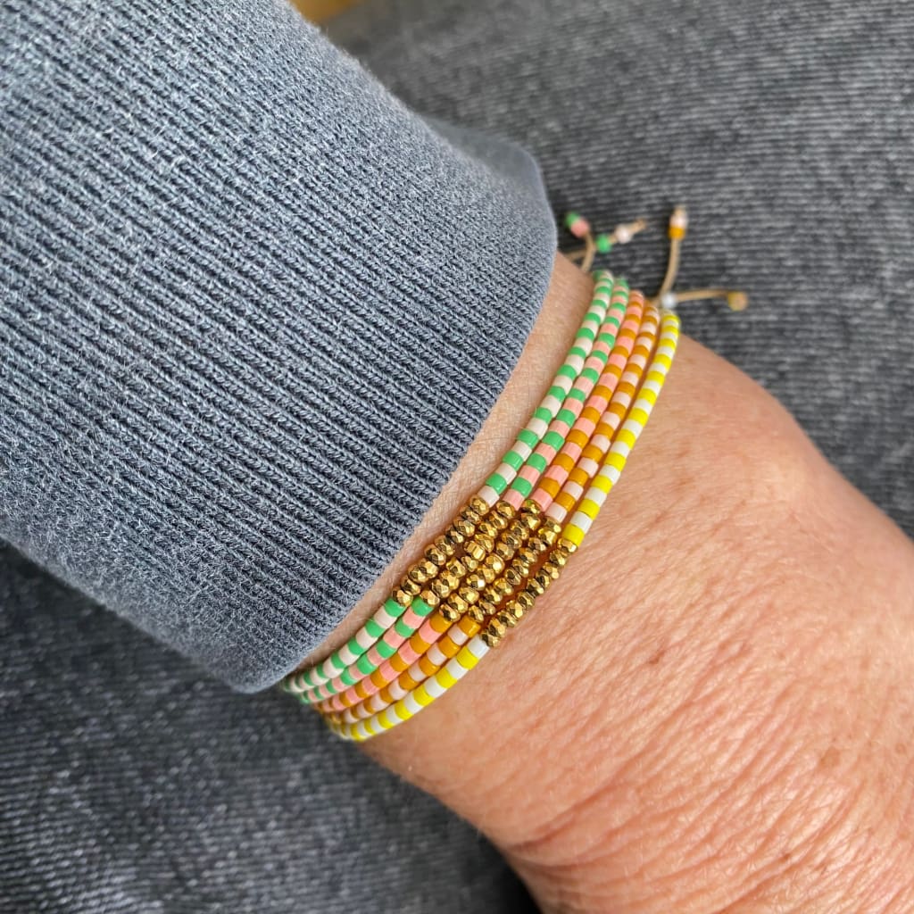 Bracelet sur cordon polyester, composé de rocailles miyuki délica et d'une barrette en hématites dorées. Vous trouverez en ce bracelet un éclat étincelant avec un large choix de couleurs, qui fera votre bonheur ou la joie de pouvoir l’offrir.