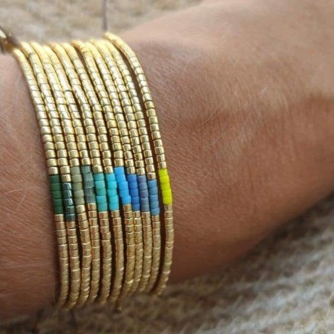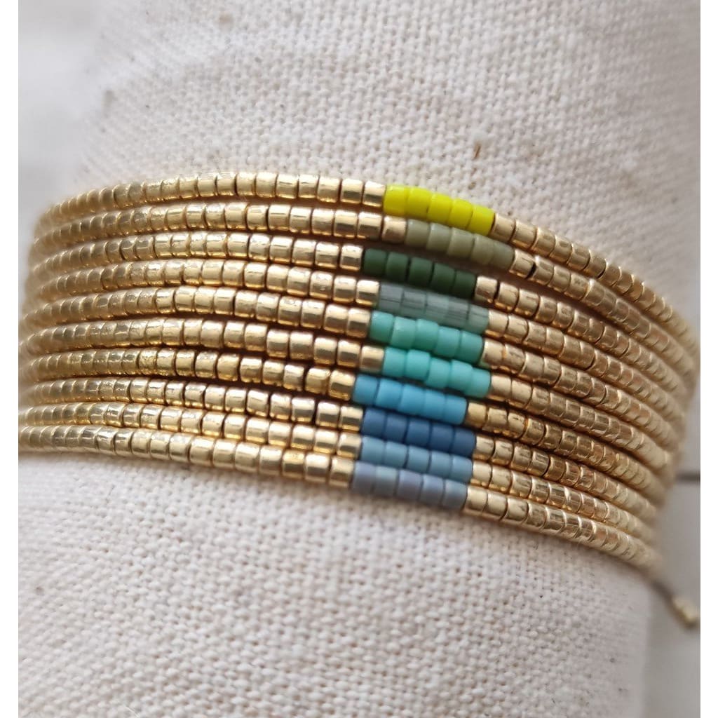 Bracelet sur cordon polyester, composé de rocailles miyuki délica dorées et de couleur. Vous trouverez en ce bracelet un éclat étincelant avec un large choix de couleurs, qui fera votre bonheur ou celui de la joie de pouvoir l’offrir.